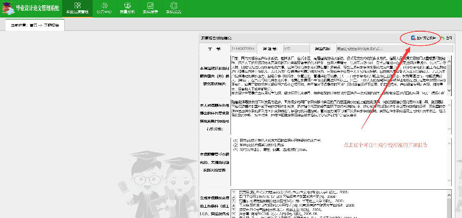 开题报告由学生在毕业设计管理系统中提交——导师填写审阅意见后,可以在系统中生成带评语的开题报告,打印即可,操作见下图。