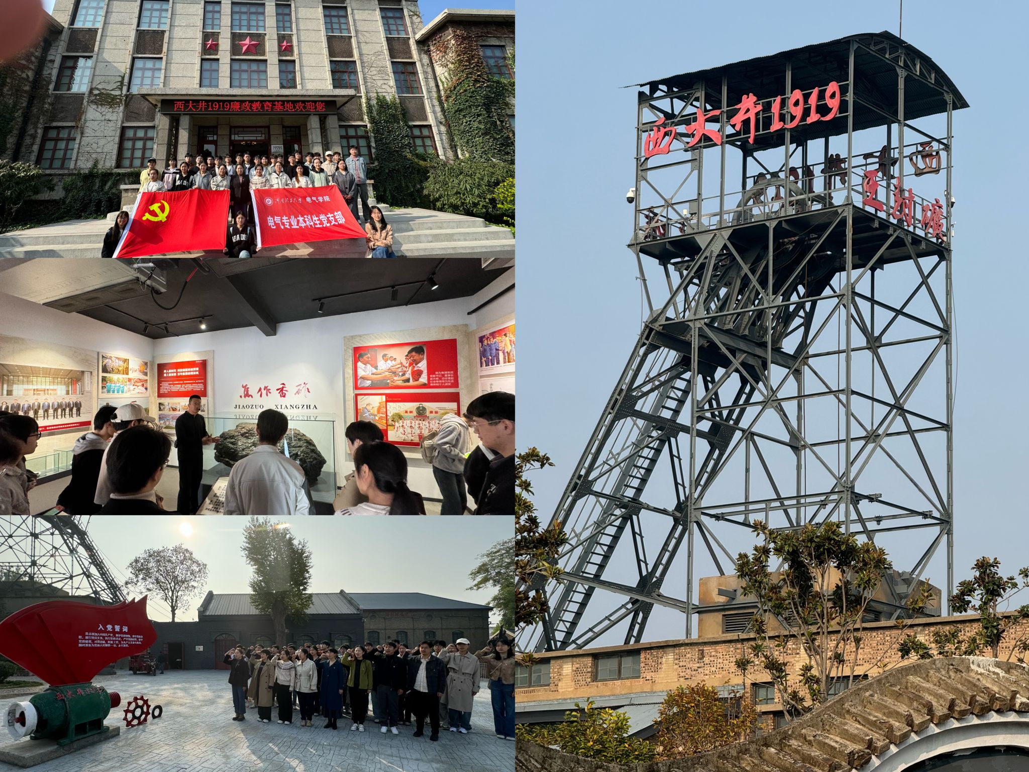 在讲解员的带领下,全体人员参观了反帝大罢工陈列馆、王封矿井井架、国旗教育馆、焦作楷模人物馆、“洞见1969”、家风家训文化馆和廉洁教育基地等纪念地。展览馆内陈列着大量珍贵的历史照片、文物和文献资料,展现了焦作煤矿工人在不同历史时期的奋斗历程。之后,全体党员师生一起在英雄广场重温入党誓词,高举的拳头、胸前的党员徽章,坚定着中国共产党的初心使命。通过观看情景剧、听取讲解、开展交流,支部成员深入回顾了焦作煤矿1925年的反帝大罢工、支援社会主义建设等重大历史事件,切实感受了工人阶级英勇不屈的斗争精神和自强不息的拼搏精神,充分认识到“特别能战斗”精神在取得民族独立和社会主义建设各时期的重要作用。同时,通过讲解员讲解,支部成员还了解到我校和西大井有着深厚的渊源关系,和“特别能战斗”精神有着一脉相承的血脉联系。