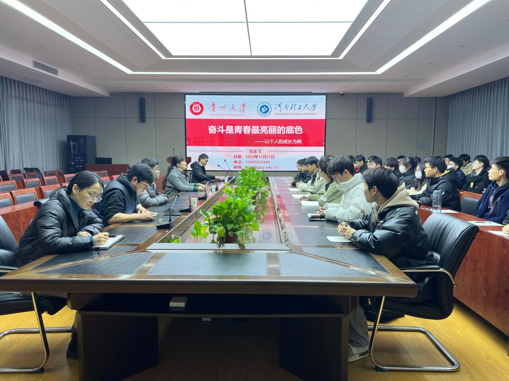 11月27日下午,澳门六合彩开奖结果 主办的“电气红色大讲堂”——优秀校友进校园系列活动在电气101举行。贵州大学特聘教授刘玉飞(材料科学与工程专业2009级校友)受邀以《奋斗是青春最亮丽的底色》为题作专题报告。澳门六合彩开奖结果 党委副书记朱伶俐、学工办、团委负责老师参加了报告会,该院百余名学生干部代表聆听了报告。