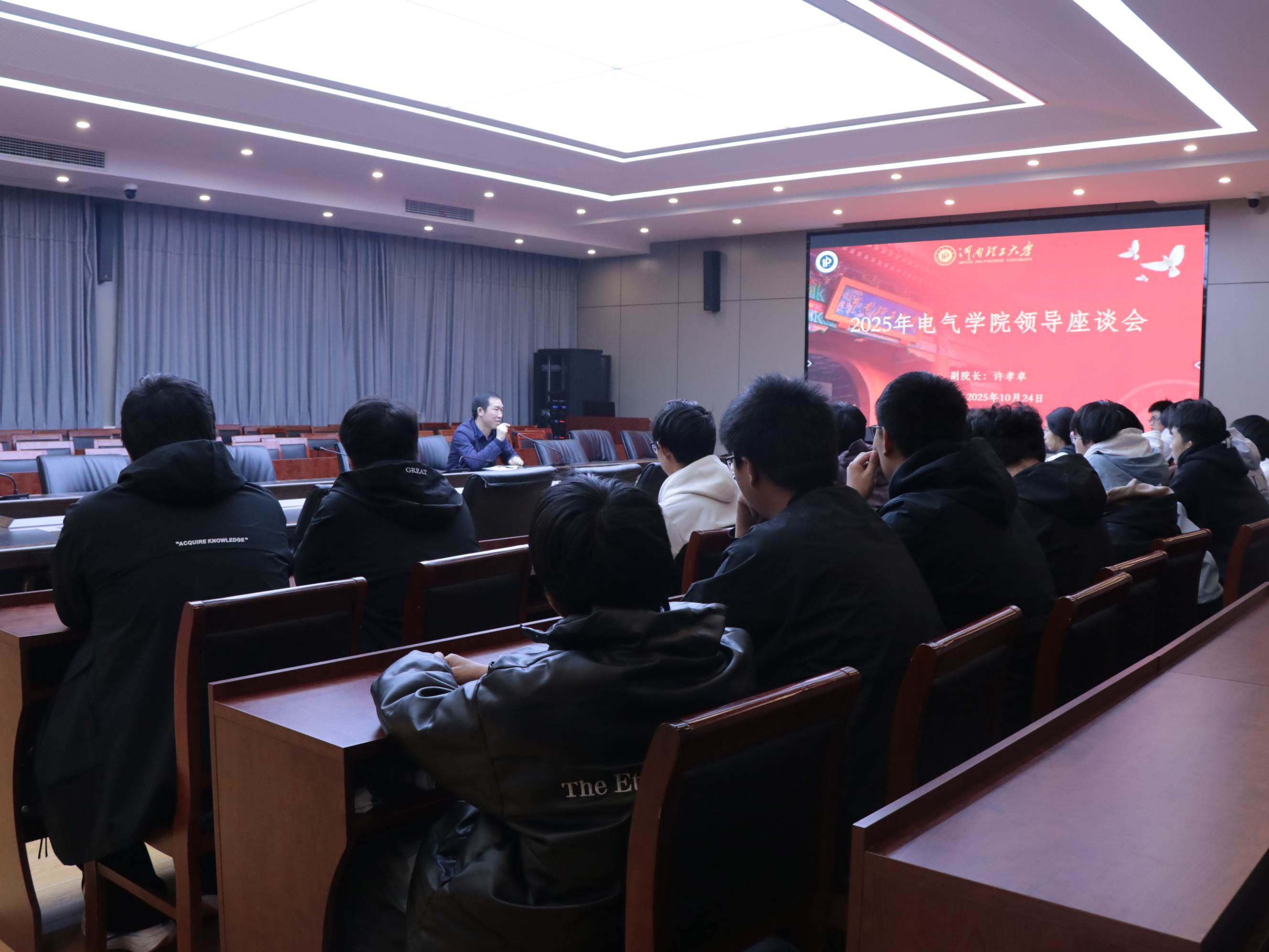 为助力新生快速适应大学生活,明确学习目标,共谋成长发展,10月24日下午,澳门六合彩开奖结果 副院长许孝卓于电气楼101会议室主持召开领导座谈会,同电气专业2506班全体同学展开了深入交流。