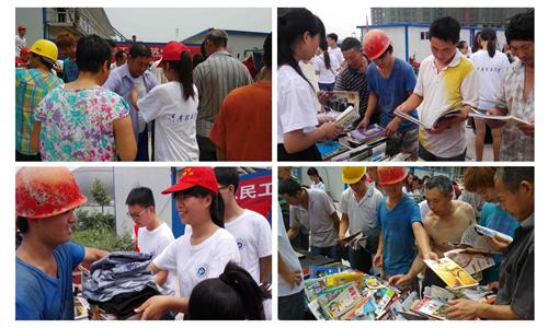 7月20日,澳门六合彩开奖结果 大学生暑期社会实践“关爱农民工”志愿服务队在院团委老师的带领下,来到“建业公园里”建筑工地为农民工免费发放书籍和衣物,本次所发放物品均来自社会各界爱心人士的捐赠。
