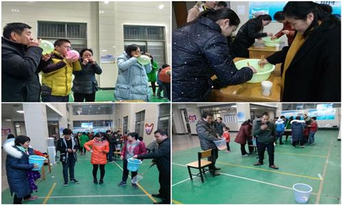 下午5时30分,游园活动正式开始,五个精心设计的小游戏吸引了众多师生,活动现场人声鼎沸,弥漫着浓浓节日气氛。“抛绣球”以羽毛球为道具,两人一组,一人背筐一人击球,背筐者距离投球者2米,球以球拍击打的方式进入背筐者为有效进球,在2分钟内接球最多者获胜,有的组员之间配合欠佳,接球者姿势怪异,引来围观师生阵阵笑声。“我是球王”一次参赛2人,参赛者站在距离目标2米的地方,在一分钟内用手向地上掷乒乓球,球反弹后落入桶内为一次有效进球,进球多者为胜,小小的乒乓球难住了不少“英雄好汉”。“吹球大王”则看谁在2分钟之内吹破的气球最多,大家围成一圈进行比拼,场面甚是热闹。游戏之余,师生之间互道祝福,送上彼此美好的祝愿。