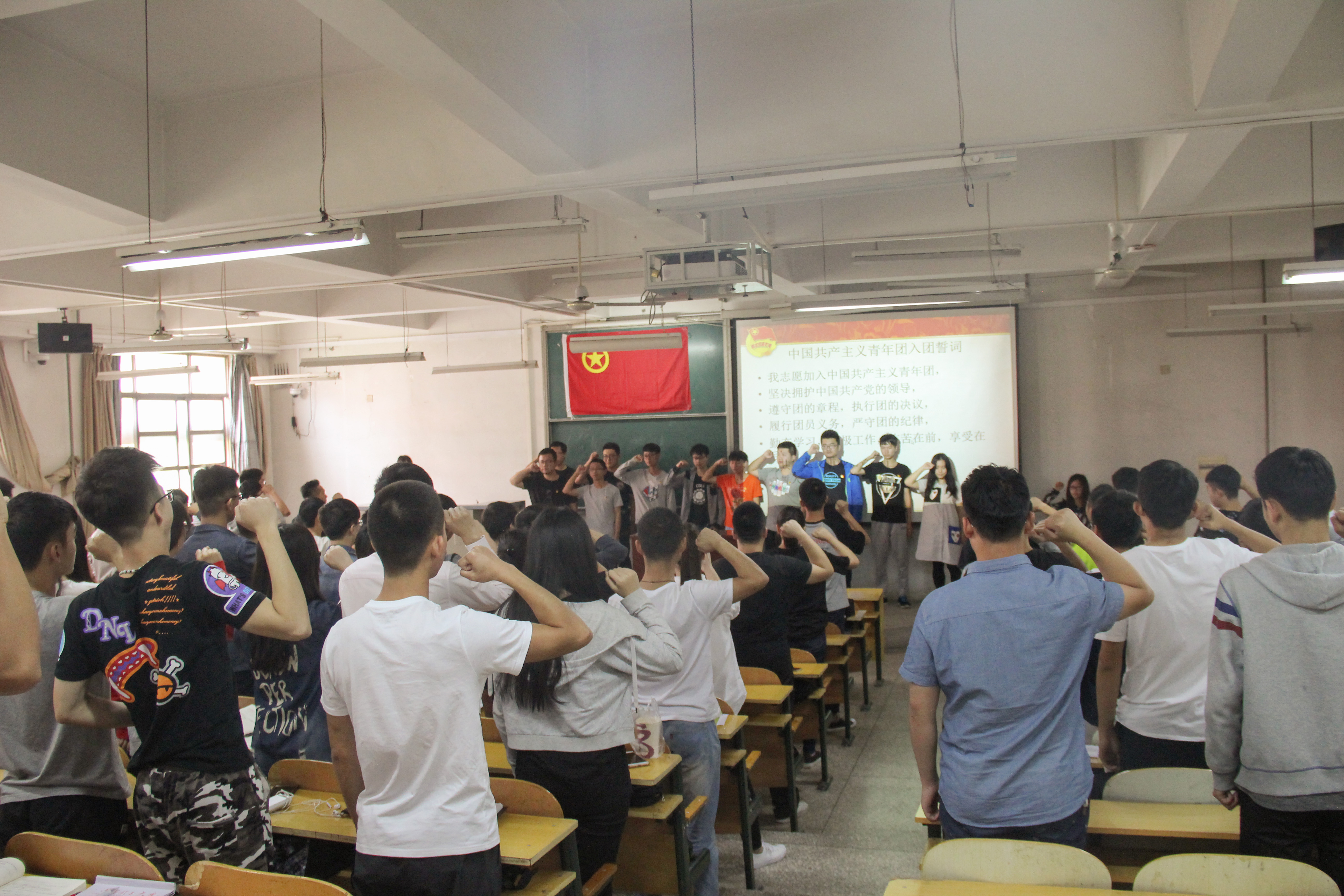 首先,同学们观看了视频《入团第一课》。视频围绕主角“入团”这一故事情节,带领同学们回顾了团的光荣历史和优良传统,强化了青年团员的责任意识和光荣感。随后,全体起立,奏唱国歌、团歌,由团委成员宣读新团员名单,并由老团员为新团员佩戴团徽。接着,新老团员共同宣誓。“我志愿加入中国共产主义青年团, 坚决拥护中国共产党的领导, 遵守团的章程,执行团的决议, 履行团员义务,严守团的纪律,勤奋学习,积极工作,吃苦在前,享受在后……”庄严的誓词响彻教室,此刻,每个共青团员的心中都充满了责任感与使命感,大家都有一个共同的理想,那就是为共产主义事业而奋斗。